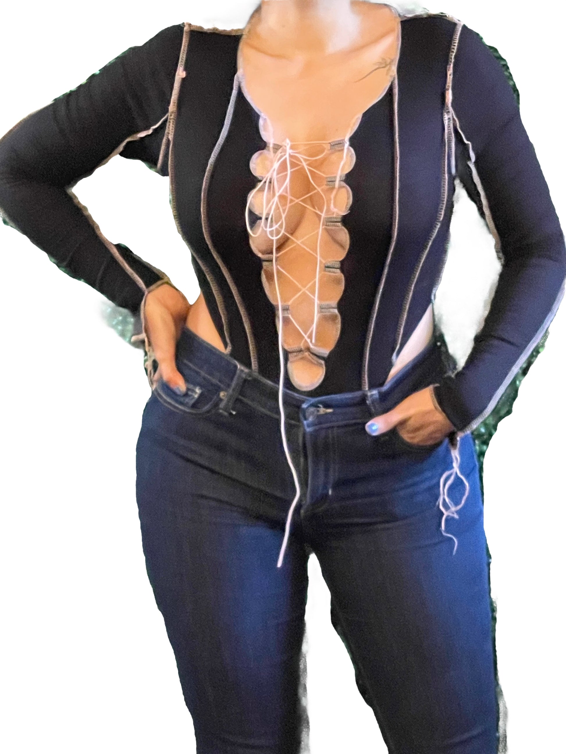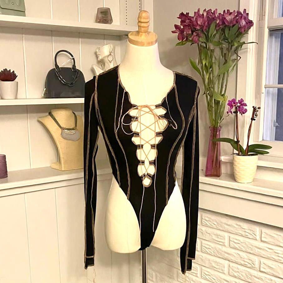 This bodysuit is made with comfortable fabric and alongside seductive lacing details. Very modern and vintage.